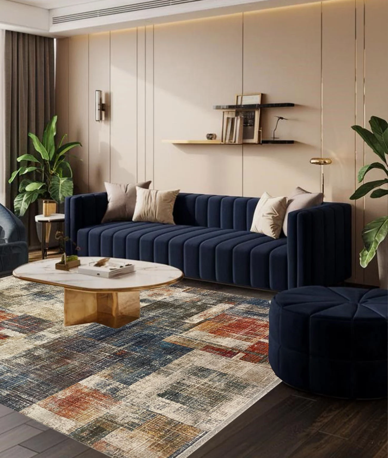 Tepih u nijansama indigo plave i sive, sa delikatnim arabeskama. Donosi osećaj dubine i smirenosti u svaku prostoriju.