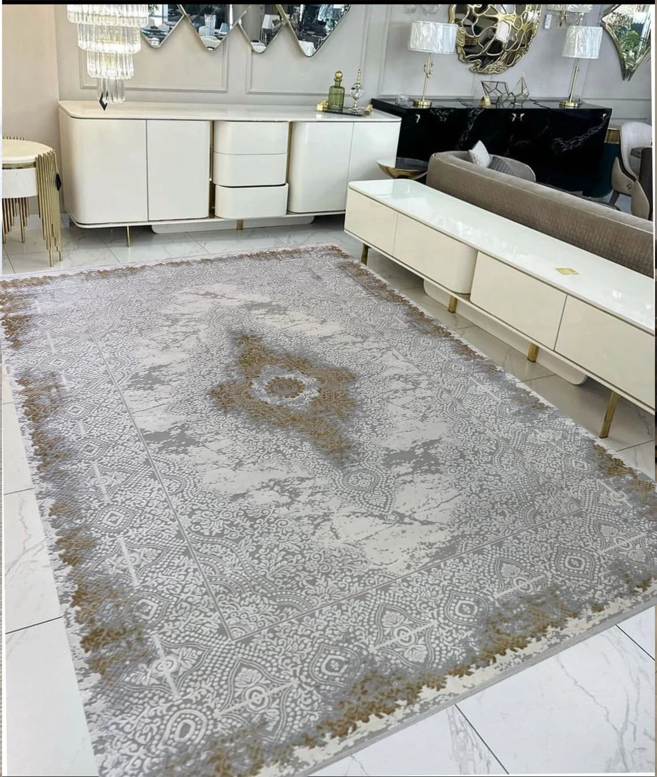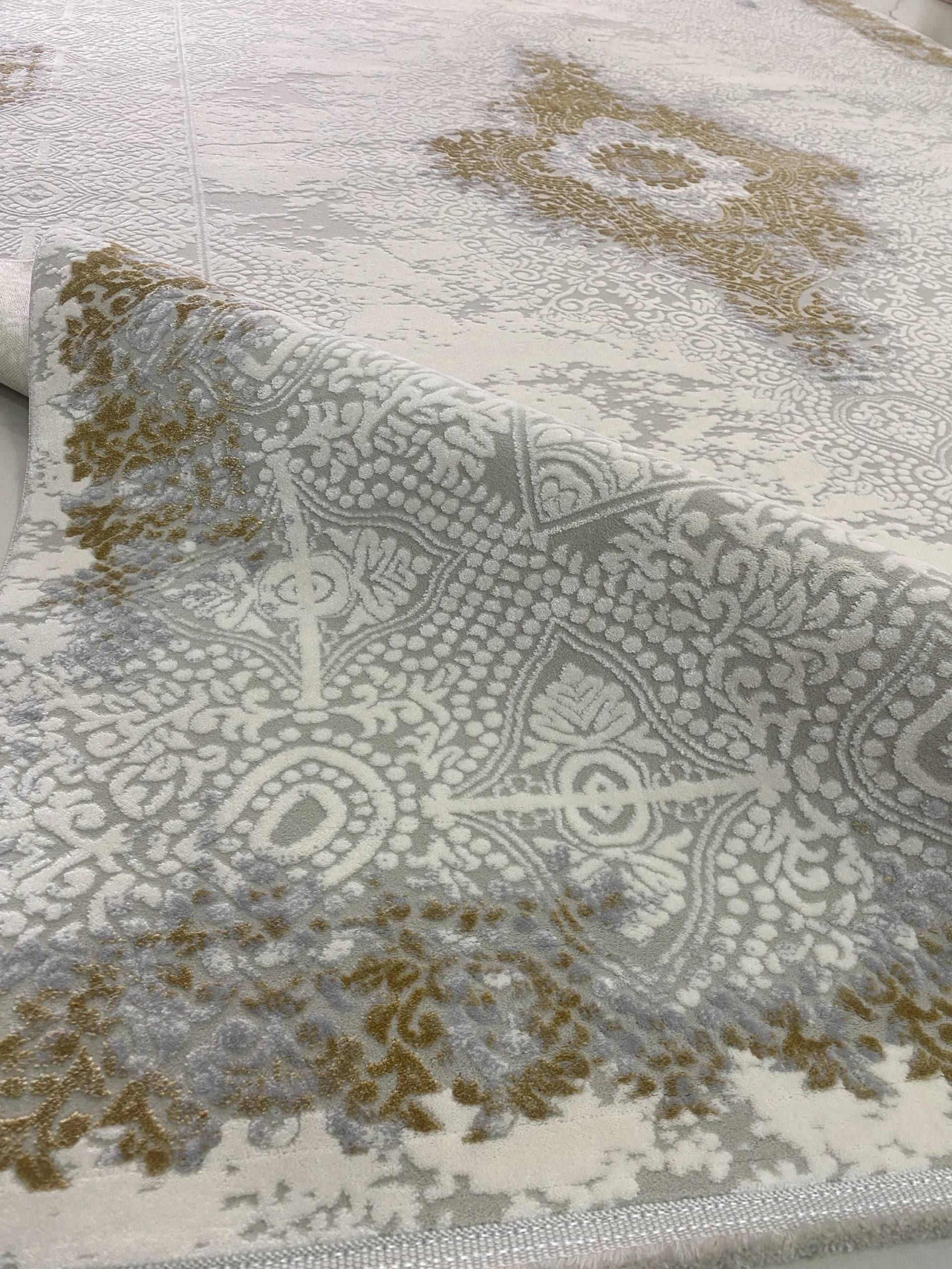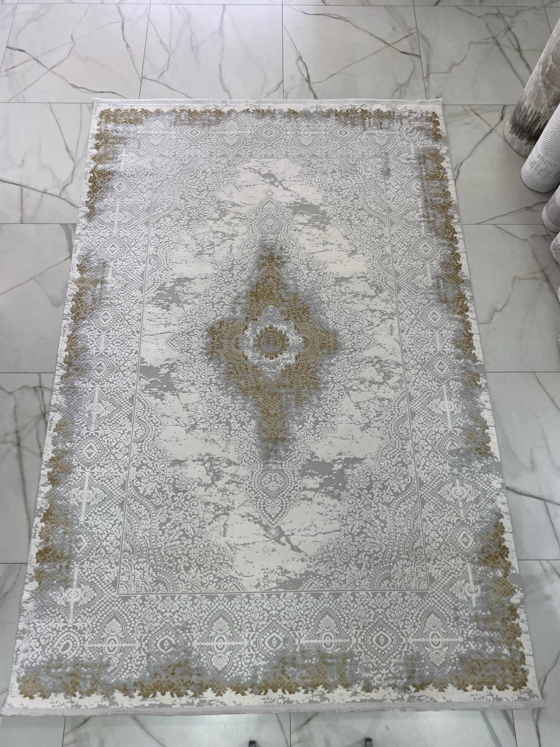 Kašmirski tepih sa bogatom teksturom i reljefnim dezenom. Kombinuje tople tonove peska, meda i bronze – pravi izbor za luksuzne enterijere.